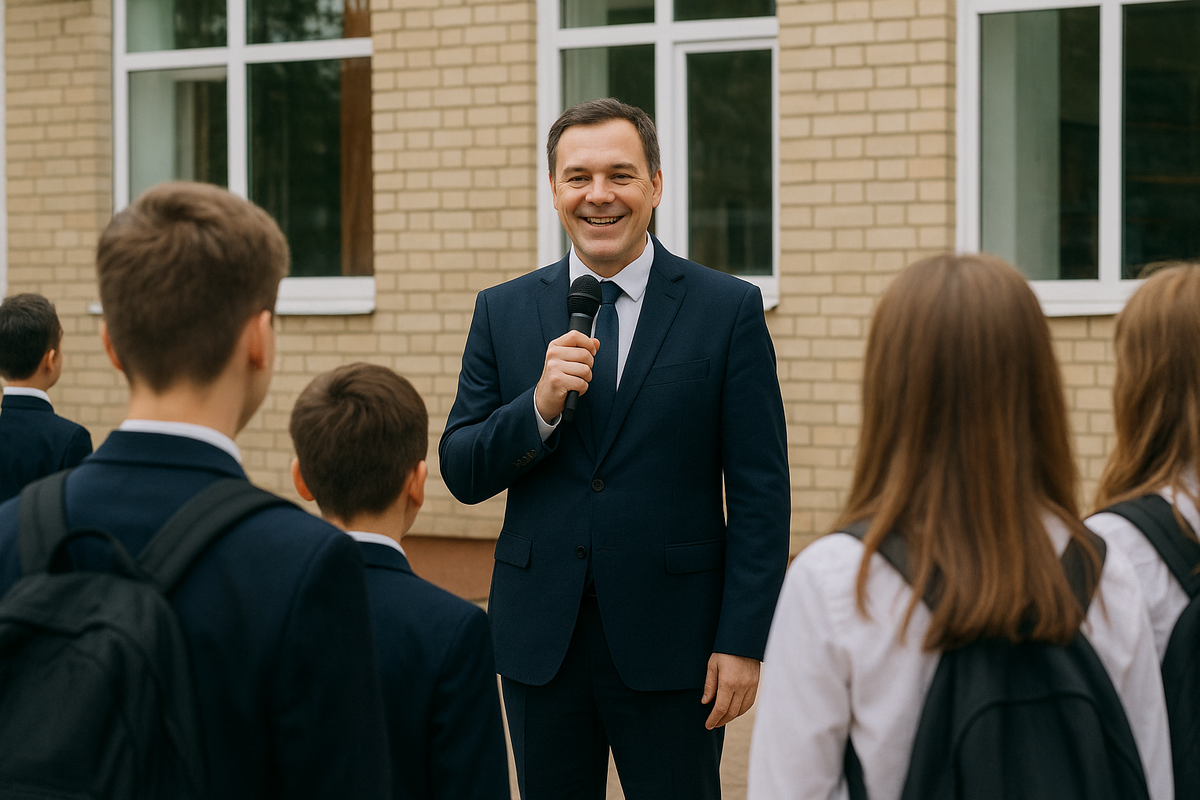 На утренней линейке, когда ученики выстроились, Виктор Петрович, строгий, но добродушный директор, взял микрофон и, приветливо улыбаясь, обратился к школьникам: