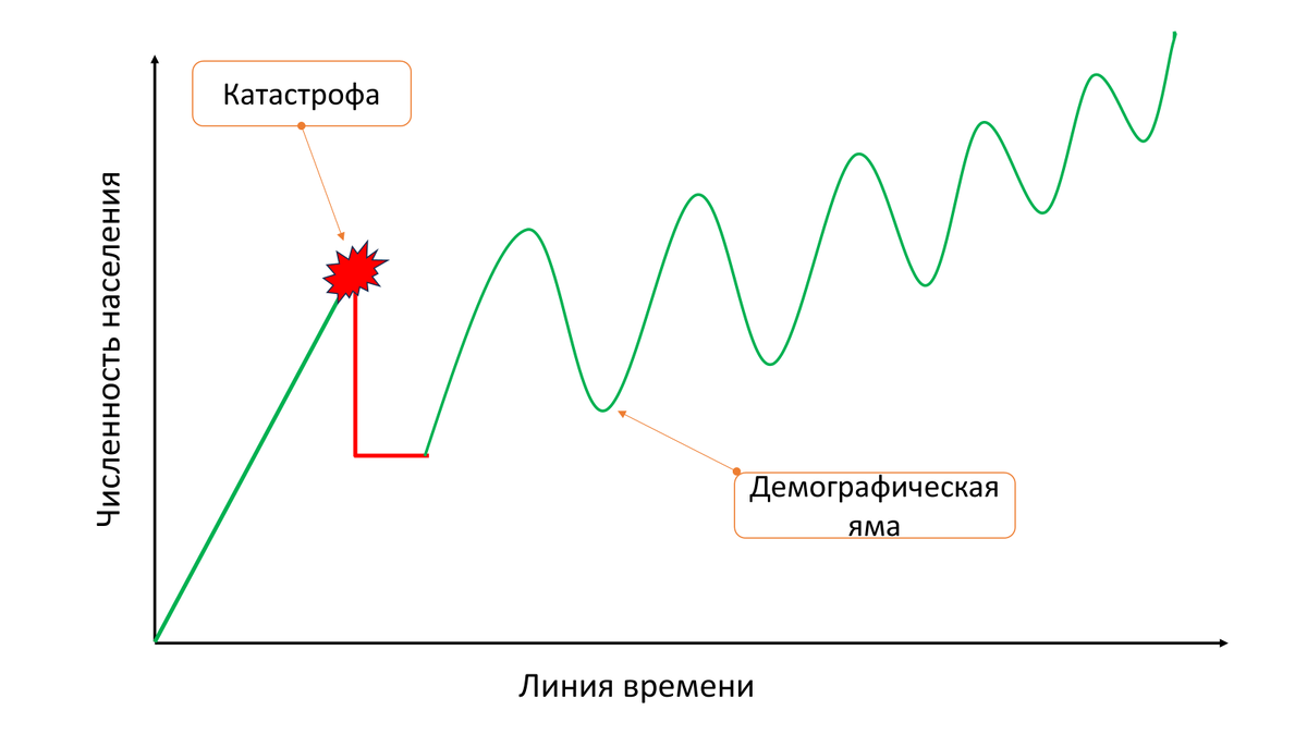 Для нашей страны последней такой катастрофой явились 40-е годы двадцатого века, когда во время войны погибли миллионы людей. Причем особый урон понесло поколение, наиболее способное к деторождению. Более того, в этот небольшой по меркам истории промежуток времени у нас некому и некогда было рожать. Именно поэтому поколение детей, рожденных в годы войны очень малочисленное. По окончании войны мы стали восстанавливать не только разрушенное хозяйство, но и упавшую рождаемость, и график снова прямо пропорционально пополз вверх, но… поколение детей войны выросло, и настал черед им стать папами и мамами. А их мало, поэтому и детишек, рожденных от них, будет мало. На графике образуется так называемая «демографическая яма». Такие же ямы будут снова появляться, когда будут рожать внуки детей войны, правнуки, праправнуки и т.д. В долгосрочной перспективе эта синусоидальная линия имеет тенденцию к сглаживанию и превращению в прямую (если не будет катастроф!), но сегодня мы еще очень сильно ощущаем эту демографическую волну. Даже поддержка правительством материнства и детства мало влияет на ее величину. И когда сегодня кричат о падении рождаемости, то причину нужно искать не в величине материнского капитала, а в том, что произошло много лет назад. Конечно, сегодня в России создана хорошая система поддержки материнства и детства, но кардинально изменить действие демографических волн невозможно.