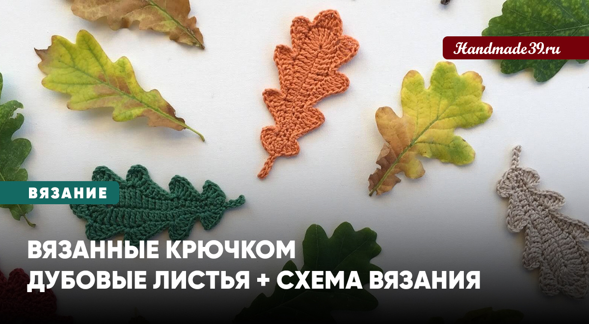 Вязанные крючком дубовые листья можно использовать как аппликацию на одежде, как дополнительный декор сумочки или скатерти. Из элементов Дубовый лист можно создать и самостоятельное изделие в технике фриформ. Всё зависит только от фантазии мастера! Материалы: крючок 2,5 мм и пряжа соответствующей толщины. Смотрите рекомендации на упаковке! Приблизительный размер листа: длина 10 см, ширина 5 см. Совет: хорошо смотрятся листья, связанные из мерсеризованного хлопка Вяжем цепочку из 20 ВП. 1 ряд: во 2-ю петлю от крючка 4 СБН, 4 П1Н, 5 С1Н, 5 С2Н, 8 С2Н в последнюю петлю, поворот. Далее вяжем в обратном порядке: 5 С2Н, 5 С1Н, 4 П1Н, 4 СБН, ПБН в последнюю петлю 2 ряд: 1 П1Н в 1-ый СБН 1-го ряда, пропустить след. петлю, *3 С1Н, 3 ВП, 1 ПБН* — в след. петлю 1 ПБН, 1 СБН, 1 П1Н, 1С1Н, *3 С2Н, 4 ВП, 1 ПБН* — в след. петлю 1 ПБН, 1 СБН, 1 П1Н, 3 С1Н, *3 С2Н, 4 ВП, 1 ПБН* — в след. петлю 1 ПБН, 1 СБН, 1 П1Н, 1С1Н, *2 С2Н, 4 ВП, 1 ПБН* — в след. петлю 1 ПБН, *1 П1Н, 1 С1Н, 1 С2Н* — в след. пе