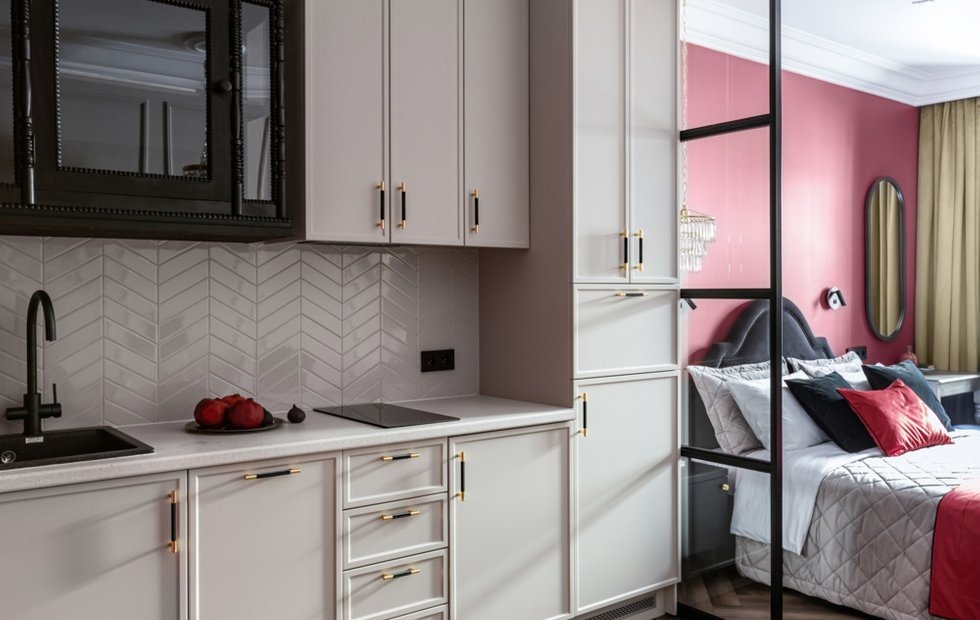 Рассказываем, какие изменения произошли в квартире в дореволюционном доме 1901 года постройки Место: Санкт-Петербург Метраж: 26 кв. м Cанузлы: 1 Дизайн: Ксения Гузий Стилист: ИРИНА ГЕНДЕЛЕВА Фото: ТАТЬЯНА НИКИТИНА Ксения Гузий полностью переделала квартиру в дореволюционном доме 1901 года постройки. Это было помещение общей площадью 66 м², которое требовалось разделить на две полноценные студии со своими кухней и санузлом, а также обустроить общую входную зону и хозяйственную комнату. Мы уже рассказывали про апартаменты с двумя окнами площадью 28 кв. м. В этой статье речь о вторых апартаментах с одним окном с малиновыми акцентами в отделке. Изначально квартира была двухкомнатной с кухней и одним санузлом. Когда дизайнер начала работу над проектом, уже был произведен демонтаж и помещение было единым. Так как квартира находится на первом этаже, планировочных ограничений не было. Все коммуникации разводили по подвалу, все новое. Перегородки возводили новые, с шумоизоляцией, установили нов