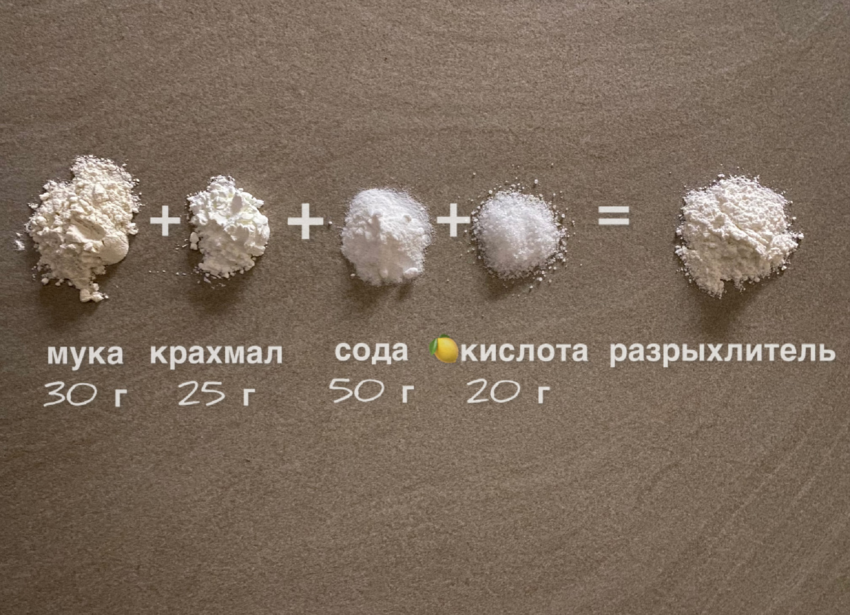 ИНГРЕДИЕНТЫ: мука - 30 г крахмал кукурузный - 25 г сода - 50 г лимонная кислота - 20 г Если лимонная кислота крупная, ее нужно измельчить. Все ингредиенты смешать. Хранить в плотно закрытой таре.