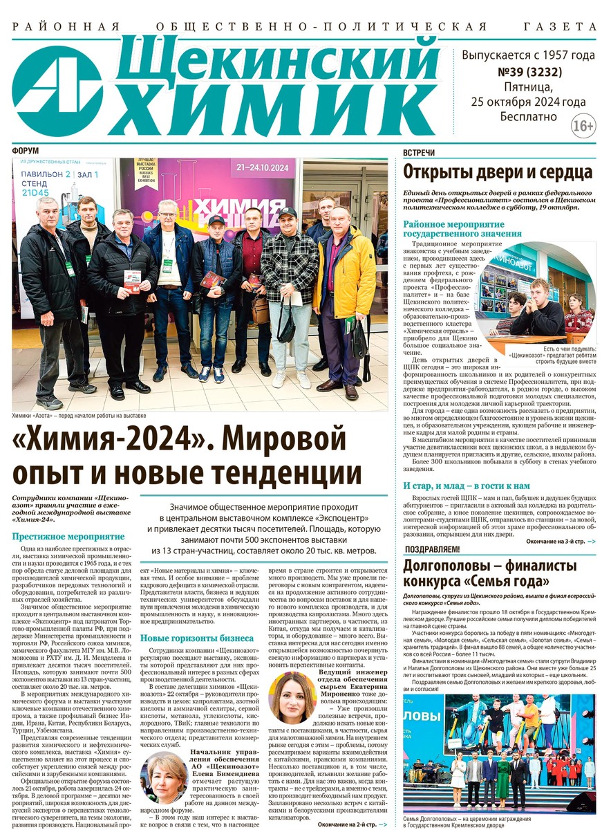 Яркая, интересная, затрагивающая разные темы – все это о газете коллектива щекинских химиков и края. Для подготовки этого номера наши журналисты: – съездили в Москву на международный форум «Химия-2024» – прочитали детские книжки и посетили книжный фестиваль под патронатом «Щекиноазота» – узнали, как себя чувствует региональная экономика – посетили концерты и спортивные турниры – заглянули в автотранспортный цех «Азота, пообщались с людьми – поработали на Едином дне открытых дверей в ЩПК – сформировали подборку актуальных вакансий компании – выведали, насколько подорожает проезд в городском транспорте. И теперь этими новостями мы делимся с читателями! Встречайте «Щекинский химик» – будьте в курсе заводской и районной жизни! Газета распространяется бесплатно. Получайте в точках выкладки в Щекино и Первомайском (адреса – в комментариях).