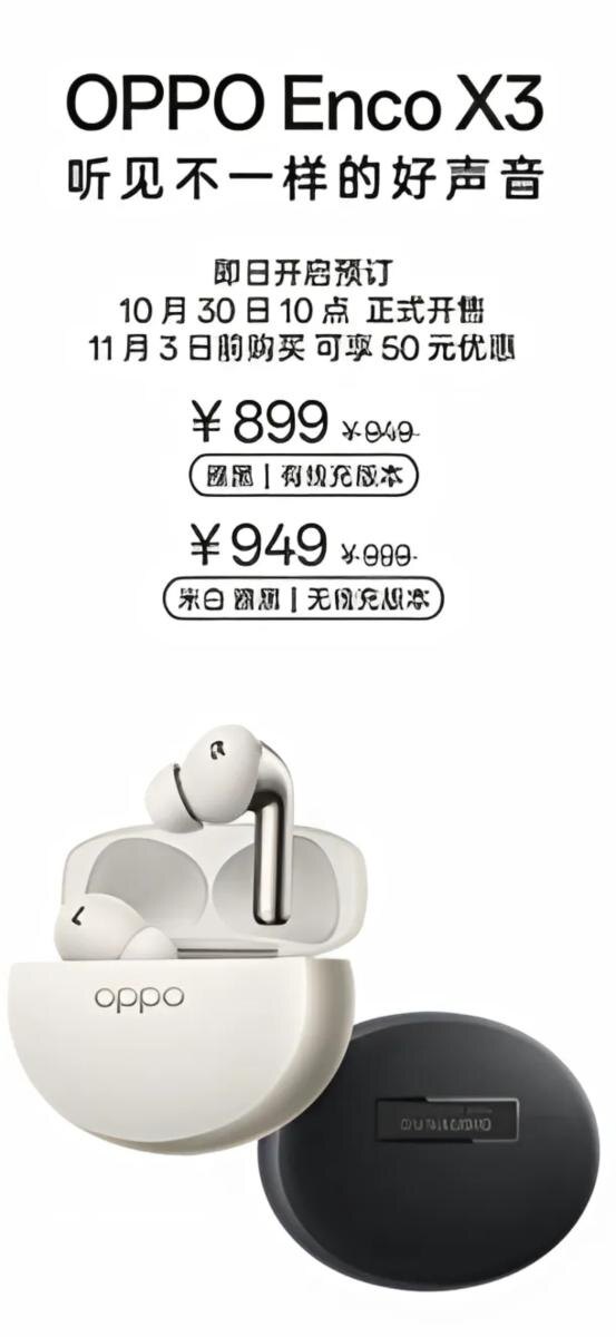 Используя флагманскую технологию шумоподавления с четырьмя микрофонами, включая три обычных микрофона и микрофон костной проводимости, Oрро Enco X3 могут достигать глубины активного шумоподавления до 50 дБ и ширины шумоподавления до 5500 Гц. Кроме того, наушники были оптимизированы для наиболее распространённых сценариев голосового шума, что почти вдвое улучшило эффект подавления голосового шума. Также данные наушники вводят инновационную технологию Bluetooth Black на сверхдальних расстояниях, известную как Smart Bluetooth. Эта технология обеспечивает соединение Bluetooth на расстоянии до 400 метров с непрерывным соединением, позволяя наслаждаться высококачественным звуком Hi-Res. На данный момент наушники Oрро Enco X3 доступны в двух версиях: с проводной зарядкой и с беспроводной зарядкой. Первоначальная цена составляет 899 юаней (примерно 12 200 рублей) для версии с проводной зарядкой и 949 юаней (примерно 12 900 рублей) для версии с беспроводной зарядкой.
