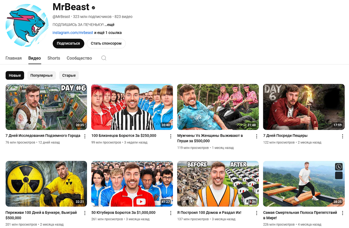У меня по жизни как-то всегда так получается, что я сильно опаздываю везде со всякими там трендами, хитами и всем таким прочим, вот несколько самых показательных историй, которые сходу приходят на ум: Сейчас, похоже, происходит еще одна такая история, я тут внезапно и основательно подсел на ютуб канал Мистера Биста (MrBeast, реальное имя Джимми Дональдсон - Jimmy Donaldson), наверняка вы услышали о нем куда раньше меньше, потому что это... Сейчас у него 323 миллиона подписчиков, с ума сойти, это же как все население России целиком, да еще и взятое дважды 😲 Этот паренек 26 лет от роду раздает направо и налево сотни тысяч долларов, "Теслы" и всякие прочие дорогостоящие ништяки, устраивая всевозможные челленджи, приключения и т.п. Например, у него есть видео, где полностью воспроизведена история "Игра в кальмара", со всеми испытаниями, с полным сохранением стилистики и антуража, но без фатальных последствий для игроков, конечно 😄 У этого видео уже 662 МИЛЛИОНА ПРОСМОТРОВ! Главное, все е