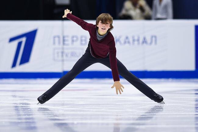 Михаил Алексахин. Тренер Евгений Плющенко. Молодец! Практически справился с программой. Четверной тулуп с тройным тулупом - чисто. Четверной сальхов - неплохо! Четверной тулуп -чисто. Тройной аксель с двумя двойными акселями, недокрут на галку на первом. Второй тройной аксель - чисто. Но в конце уже сдвоил тройной лутц и допустил помарку на приземлении с 3Ф+3Р.