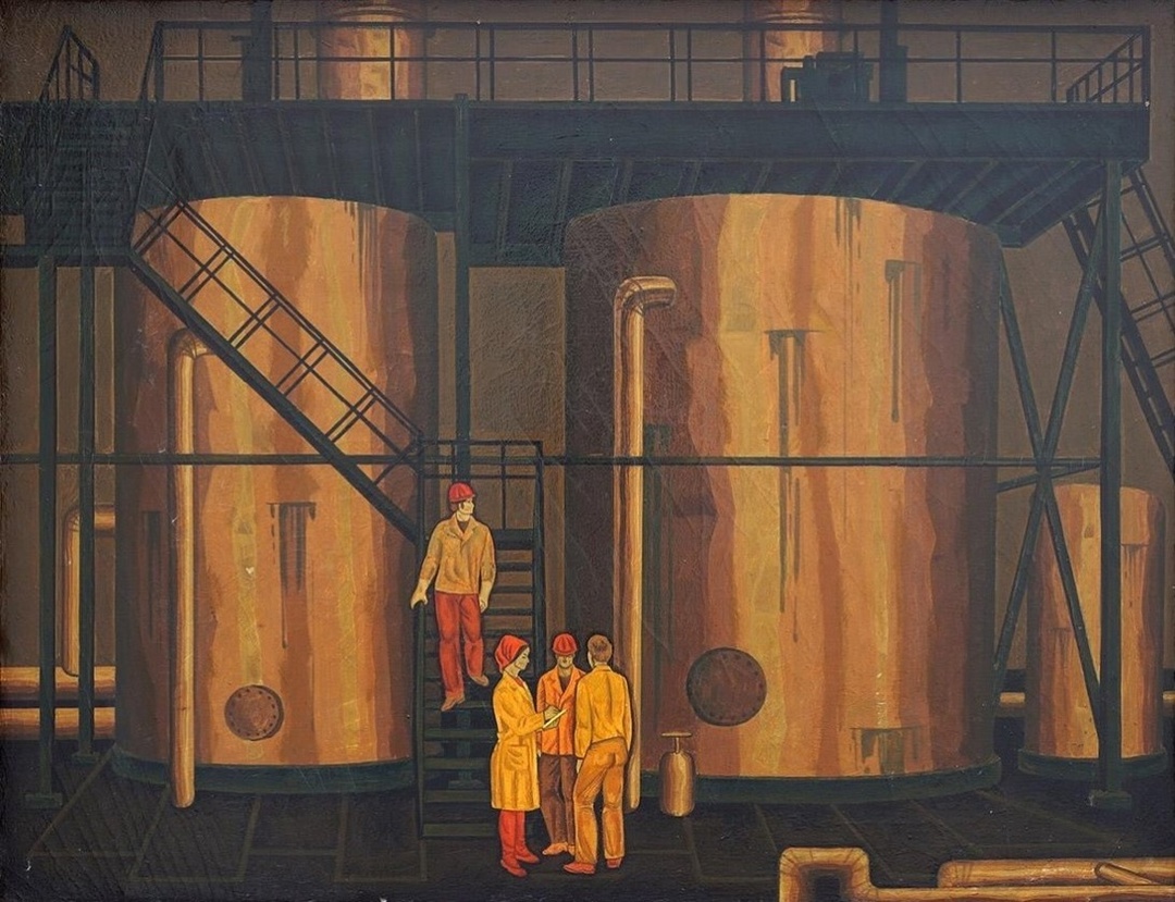 Мы продолжаем цикл публикаций, который посвящён 75-летию нашего химического предприятия. Помощниками при его подготовке стали коллеги — профессиональное сообщество «Идеи для музеев», а также выставочные центры, музеи и галереи, в чьих фондах хранятся произведения искусства, посвящённые науке, химии, лабораториям, учёным, школьным урокам химии, заводским цехам. Сегодня мы расскажем об экспонате из коллекции Краснодарского краевого художественного музея имени Ф.А. Коваленко — картине Василия Медведовского «Белореченский химкомбинат. Цех серной кислоты». (1978. холст, масло, темпера).