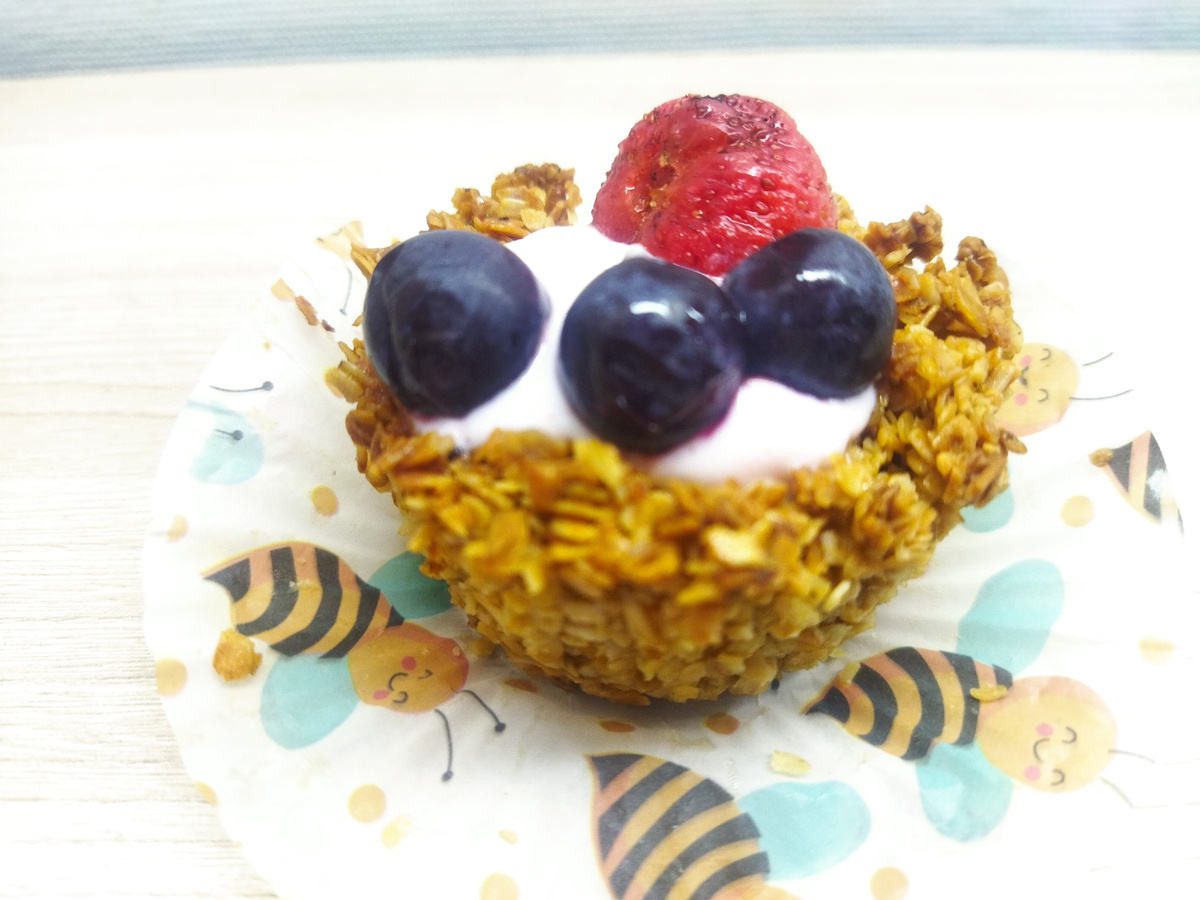 Знаете ли вы, что такое гранола? И с чем ее едят?! Я вот узнала только сегодня. И не только узнала, а даже приготовила... И даже попробовала. Ну, неплохо, в общем то. Вот она - гранола в виде чашечек с йогуртом . Так рецепт называется в книжке, которую мне вчера в супермаркете вручили. Со словами: "Возьмите, там рецепты интересные". И вот этими рецептами и заинтересовались мои мальчишки . А как не заинтересоваться, названия то какие: куриные стрипсы, клаб-сэндвич, сырне, паста и гранола. Я бы тоже заинтересовалась, если бы готовил всю эту экзотику кто-то другой. Но, просили, просили и выпросили. Просили, кстати, все. Я согласилась на пиццу, гранолу и стрипсы. Куриные. Итак, для гранолы нужно взять овсяные хлопья, те, которые долго нужно варить, не менее 15 минут, 220 гр. Измельчённые орехи (50 гр.) и кокосовую стружку (30 гр.). Мед жидкий - 100 гр., щепотку соли и 2 столовые ложки растительного масла. Все тщательно перемешать. Взять форму для кексов, накрыть ее пергаментом и выклад