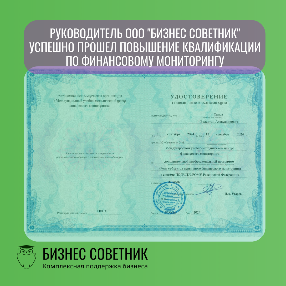 Руководитель ООО "Бизнес Советник", Валентин Орлов, успешно завершил программу повышения квалификации, организованную Международным учебно-методическим центром по финансовому мониторингу (МУМЦФМ). Программа была предназначена для организаций-партнеров МУМЦФМ, специализирующихся на обучении в сфере противодействия отмыванию доходов, полученных преступным путем, и финансированию терроризма (ПОД/ФТ). В течение трёх дней участники программы изучали широкий спектр тем, связанных с актуальными аспектами ПОД/ФТ: Как отметил Валентин Орлов: "Для нас, как учебного центра по финансовому мониторингу крайне важно постоянно обновлять свои знания и навыки. Обучение в МУМЦФМ предоставляет уникальную возможность оставаться в курсе последних изменений в законодательстве и практике ПОД/ФТ. Наша компания стремится предоставлять своим клиентам высококачественные образовательные услуги, и полученные знания позволят нам ещё эффективнее обучать наших клиентов и помогать им соответствовать высоким стандартам