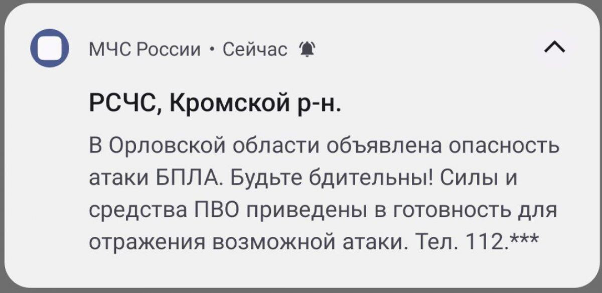 - В Орловской области объявлена опасность атаки БПЛА. Будьте бдительны! Силы и средства ПВО приведены в готовность для отражения атаки. Тел. 112, - гласит предупреждение.