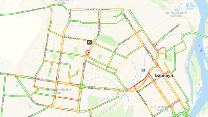 Стоит и центр, и спальная часть города Пробки интенсивностью 8 баллов из 10 образовались в Барнауле в конце рабочего дня 25 октября. Согласно данным сервиса "Яндекс.Пробки", заторы наблюдаются и в центре города, и в его спальной части. Так, в центре полностью "стоит" проспект Строителей, часть проспекта Ленина и Красноармейского, переулок Ядринцева и улица Челюскинцев. Также сильный затор на Партизанской и Гоголя. На объездной дороге пробка собралась на Загородной. В спальной части города "Яндекс" фиксирует пробки на части Павловского тракта, улице Попова, Балтийской, Власихинской. Небольшой затор образовался в районе пересечения Малахова и Антона Петрова – там произошла авария. Больше материалов на amic.ru.