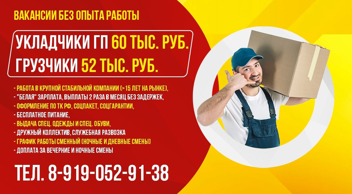 Вакансии без опыта работы: - Укладчики ГП 60 000 тыс.руб. - Грузчики 52 000 тыс.руб. | Работа в крупной стабильной производственной компании (более 15 /лет на рынке), | Полностью "белая" заработная плата, выплаты два раза в месяц без задержек, | Оформление по ТК РФ, социальный пакет, социальные гарантии, | Бесплатное питание, | Выдача спец.одежды и спец.обуви, | Дружный коллектив, | Служебная развозка | График работы сменный (ночные и дневные смены) | Доплата за вечерние и ночные смены Телефон для связи: 8 919 052 91 38 Ирина