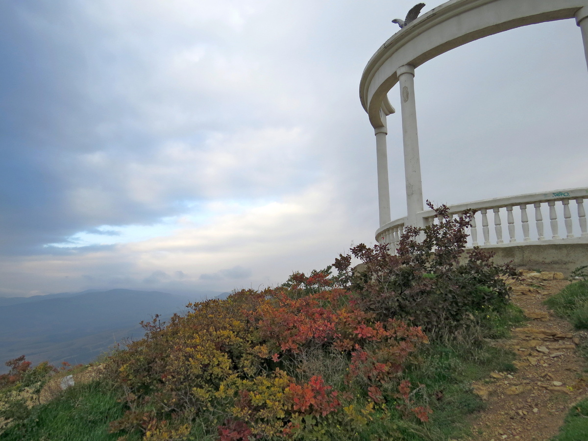 С этой вершины открывается вид на все 360 градусов! Это место имеет всего один недостаток. Это постоянные ветра. Здесь ни когда не бывает тихо. Ведь не зря здесь распологалась Высшая летно-планерная школа. Именно здесь начинали свой нелегкий путь к звездам такие известные летчики, планеристы и авиаконструкторы, как Сергей Королев, Сергей Ильюшин, Маргарита Раценская, Ольга Клепикова и многие другие. Сейчас на месте этой школы находится Центр планерного спорта «Коктебель». Это я говорю о горной подкове, опоясывающей долину Бараколь. Горе Узун-Сырт ( Гора Клементьева , Летная гора) . Коклюк, это одна из ее вершин. Почему мне захотелось прогуляться именно здесь? Потому, что осень в нашей стороне можно увидеть только по разноцветным листикам скумпии, а она очень любит этот «Длинный хребет» . Именно так переводится название Узун-Сырт. И так как он очень длинный, целых 8 км,то я придумала, что Миша отвезет меня перед работой к колоннаде Звездопад Воспоминаний, и я оттуда начну свою прогулк