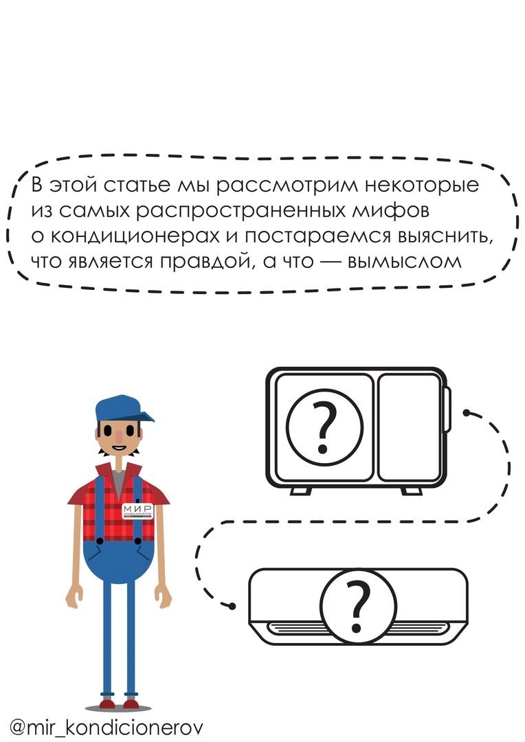 При продаже кондиционеров компания «Мир Кондиционеров» часто сталкивается с потенциальными покупателями, которые вроде и хотят себе климатическую технику, но различные предрассудки мешают им решиться на покупку. В этой статье мы рассмотрим некоторые из самых распространенных мифов о кондиционерах и постараемся выяснить, что является правдой, а что — вымыслом. Миф 1: Кондиционеры вызывают простуды и болезни Многие люди убеждены, что использование кондиционеров может привести к простудам и другим заболеваниям. Миф 2: Кондиционер потребляет много электроэнергии Некоторые считают, что кондиционеры потребляют слишком много энергии и нецелесообразно их включать, поскольку это только увеличивает счета за электричество. Миф 3: Использование кондиционера — это обязательно дорогое удовольствие Хотя стоимость установки и обслуживания кондиционеров действительно может быть высокой, это не означает, что они являются всегда дорогими. Существует широкий ассортимент моделей и брендов на рынке, включая