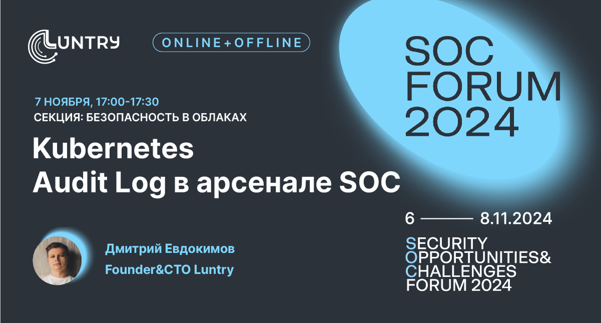 Дмитрий Евдокимов, основатель и технический директор Luntry, выступит на юбилейном SOC Forum в Москве! Дмитрий представит доклад “Kubernetes Audit Log в арсенале SOC”. Рассмотрим детали механизма Kubernetes Audit Log, разберемся, какие там есть подводные камни и слепые зоны и как максимально от него получить пользу для обнаружения злоумышленников. Доклад Дмитрия пройдет 7 ноября в 17:00, в 5 зале. Ознакомиться с подробной программой форума можно по ссылке. SOC Forum – это ключевая площадка для обмена опытом, объединяющая представителей регуляторов, лидеров отрасли информационной безопасности и технологических гигантов.