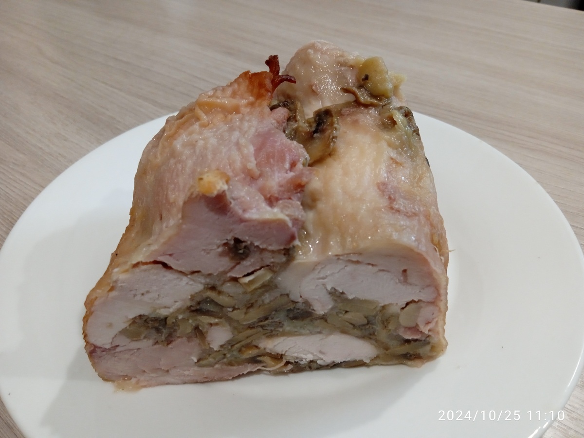 Вам понадобится : 1 крупная курица 🐔 1 кг. грибов🍄 2 шт. лука 🧅 20 гр. Желатина немного муки . Возьмите курицу - крупную . Очистите её от костей - сохранив саму курицу . Откройте её разрезав грудку и аккуратно уберите кости . Разровняйте . Срезайте мясо - где очень толстые пласты мяса и ложте туда где нет . Нарежьте грибы шампиньоны. Пожарьте грибы в небольшом количестве постного масла с луком нарезанным полу кольцами. Разведите желатин 20 гр., в 100 гр., воды - тёплой. Через 30 минут , разогрейте в микроволновке 40 секунд . Помещайте Вылейте желатин в грибы Хорошо смешайте и немного добавьте муки для густоты - немного . Выложите на куриный пласт. И заверните рулет. Я вам рекомендую завернуть рулет в фольгу . У меня её не было и я завещала натуральной верёвкой . Запекать 1 час 15 минут, температура 220 Рулет очень красивый и очень вкусный . Это очень вкусный рецепт . Это очень красиво и легко готовиться. Принимайте участие в голосовании за лучший рецепт . Мы очень рады дружит