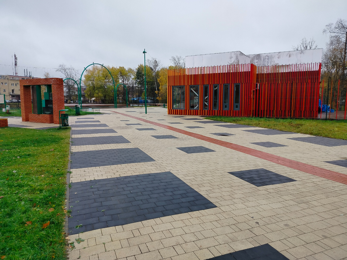 Случилось нашей троице (Аня, Полина и я) в один дождливый осенний день совершить поездку в Арзамас. Повод был, но очень маленький. Ане надо было встретиться с мамой подружки. Мы же с Полей завсегда куда-нибудь рвануть. Ей, чтобы в садик не ходить, а я просто люблю куда-нибудь смотаться. Орога до Арзамаса хорошая, красивая, но в нескольких местах идет ремонт дорожного полотна, дорогу расширяют, соединяют с платной трассой. Движение местами с пробками. Путь получается не быстрый. Приехали на ул. Ленина, решили позавтракать. Выбор едальных заведений очень большой, день рабочий, народу не много. Мы выбрали Додо пиццу. Вкусно. Далее пошли в парк. Недавно здесь было благоустройство. Такое вот необычное благоустройство. Красные деревянные объекты из досок. И акки зеленые металлические. Чистенько, есть где побегать ребенку под дождем. В конце аллеи наверное дендрарий. Но дождь усилился и мы не пошли его искать. Сцена с трибунами. Именно там и раздолье ребенку, если дождь. Вот еще такое, не