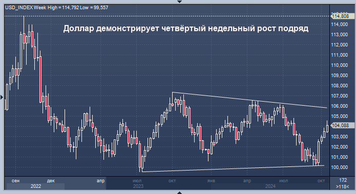 Индекс доллара, который измеряет валюту по отношению к шести основным валютам, почти не изменился и составил 104,03 после отступления от трёхмесячного пика среды 104,57. Однако за неделю он вырос на 0,54%.