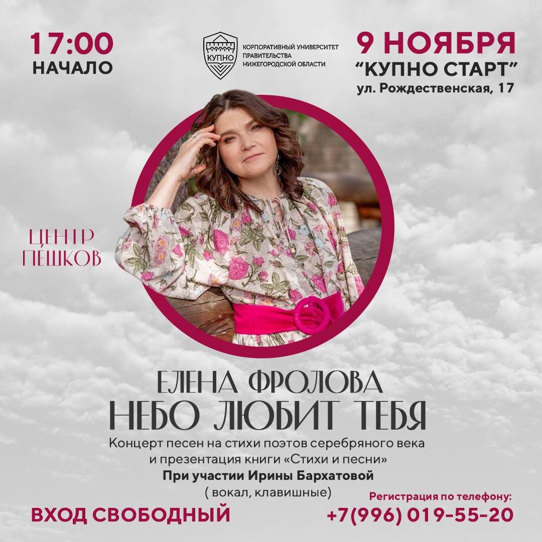 Нижний Новгород, 9 ноября, в 17:00, в Купно.Старт - зал «Павел Мельников - Печерский» ( по адресу ул. Рождественская 17 ) состоится концерт певицы ЕЛЕНЫ ФРОЛОВОЙ «НЕБО ЛЮБИТ ТЕБЯ». Прозвучат песни на стихи русских поэтов: Марины Цветаевой, Андрея Белого, Вениамина Блаженного, Марии Маховой, Анны Сеничевой и других авторов. В рамках концерта состоится презентация книги Елены Фроловой «СТИХИ и ПЕСНИ», приуроченная к 55-ти летию певицы. Так же в концерте примет участие певица Ирина Бархатова. Елена Фролова - певица, композитор, поэт. Артистка Театра музыки и поэзии Елены Камбуровой. Исполняет романсы, русские народные песни, произведения мировой и отечественной песенной классики. Аккомпанирует себе на гитаре, часто использует на своих концертах гусли или балалайку. 🎟 Регистрация на концерт. Концерт организован Нижегородским культурным центром Захара Прилепина «Центр Пешков», в рамках проекта по развитию культурных инициатив и гражданского общества «Поющие поэты. Зеркало души». Ис