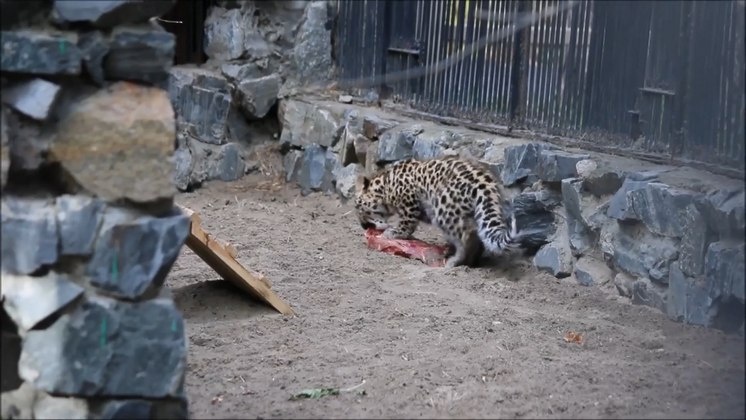 На кадрах видно, как пятнистая проказница тащит кусок мяса размером с саму себя. Такую большую добычу малышка с трудом тянет перед собой, смешно переставляя лапы, и пытается запрыгнуть вместе с лакомством в вольер.