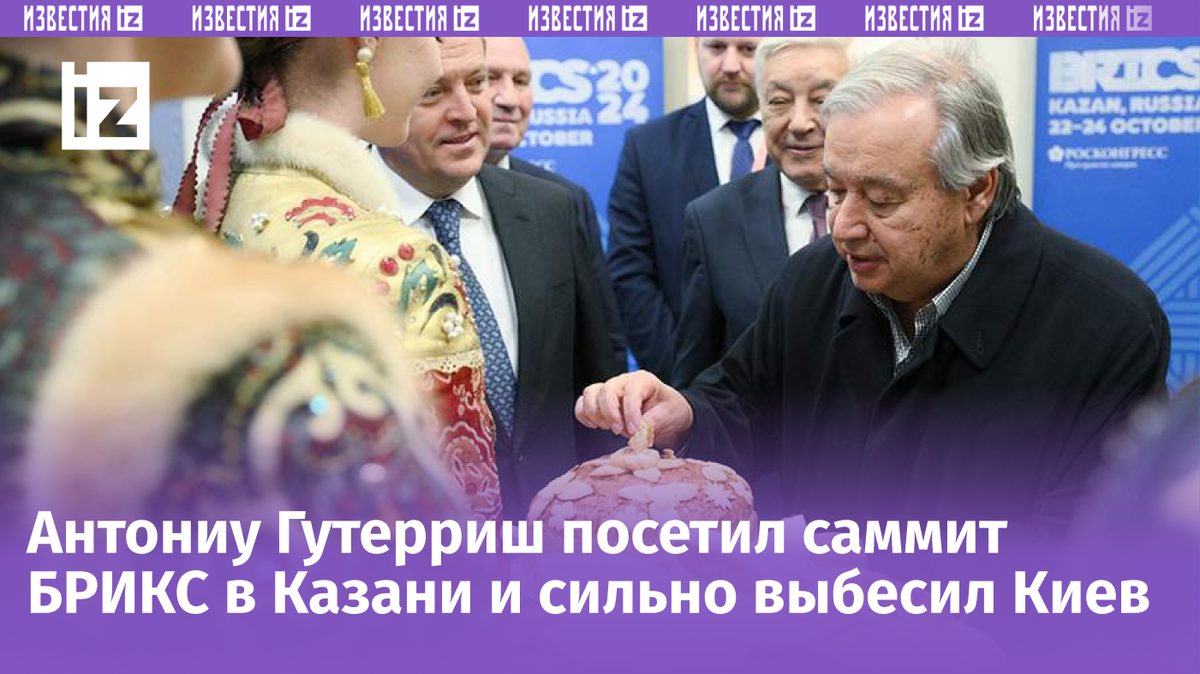 Президент Украины Владимир Зеленский, срок полномочий которого истек 20 мая, пренебрежительно высказался в адрес Генерального секретаря ООН Антониу Гутерриша из-за его визита на саммит БРИКС в Казани. «В день Объединенных наций важно, что мир не забывает про цели и принципы Устава ООН, про цель создания этой организации, хотя некоторые ее функционеры отдают предпочтение искушениям в Казани, а не содержанию Устава ООН», — заявил он в видеообращении, опубликованном в его Telegram-канале 24 октября. Зеленский также подчеркнул, что день ООН отмечается во всем мире, «а не где-то в Казани». Гутерриш прибыл на саммит БРИКС 23 октября. В международном аэропорту Казани им. Габдуллы Тукая Генсека ООН встретил председатель Государственного совета Республики Татарстан Фарид Мухаметшин. Гутерриша угостили хлебом с солью, а также традиционным блюдом Республики Татарстан чак-чаком. В ходе выступления на саммите объединения в формате «аутрич/БРИКС плюс» 24 октября Генсек ООН выразил уверенность в том,
