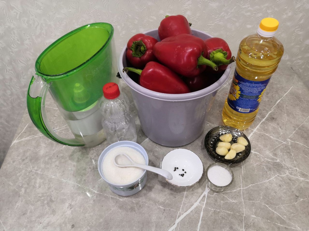 Пикантная закуска, которая подойдёт по вкусу почти всем. Можно подавать отдельно, либо дополнить гарнир к мясному блюду или для приготовления салатов. Для приготовления нам понадобится: Перец моем, чистим от семян и нарезаем кусочками удобными для закуски. Чеснок режем кружочками. В большую кастрюлю наливаем 800мл воды. Добавляем сахар. Добавляем соль. Добавляем растительное масло. Добавляем чёрный перец и хорошо перемешиваем. Ставим кастрюлю на плиту и доводим до кипения периодически помешивая. Соль и сахар должны раствориться. В кипящий маринад добавляем уксус. Перемешиваем и даем ещё немного покипеть (1-2мин). Выкладываем в маринад нарезанный перец и доводим до кипения. Варим пару минут. Добавляем нарезанный чеснок перемешиваем и варим 5-10минут. Время зависит от того какой перец вы любите. Если хотите более хрустящий то хватит и 5минут. В стерилизованные банки раскладываем перец. Оставшийся маринад ставим на плиту и доводим до кипения. Заливаем перчики маринадом до краёв банки и за