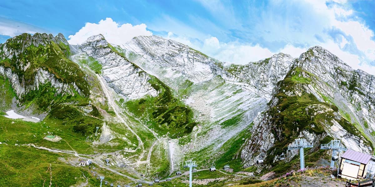 А ведь горы появились в жизни человека совсем недавно! ;)) Раньше-то как было? А раньше для части населения, там живущего, горы являлись бытностью и довольно суровой средой. Откуда, кстати, не так чтобы и сбежишь. А для целого мира (остального, «равнинного») горы оставались не более, чем своеобразным мифом. Пусть они и высились зримо, но рассказы о тамошней жизни напоминали, скорее, сказки — про злых разбойников, в основном. И никому туда, в горы, не надо было!! Первые робкие ростки бытового самосознания по осторожному путешествию в царство скал проклюнулись века с полтора назад. Не, понятно, что если уж совсем фактологически, то — раньше. Но то была экспансия государств: политическая и/или экономическая. А примерно в XIX столетии появились прообразы курортов. Ушлые коммерсанты захватили целебные места под обирание людей, деньги у которых УЖЕ были. ))) Так горы стали становиться модой. Наша страна конечно же ярко выделилась на фоне проклятых капиталистов.