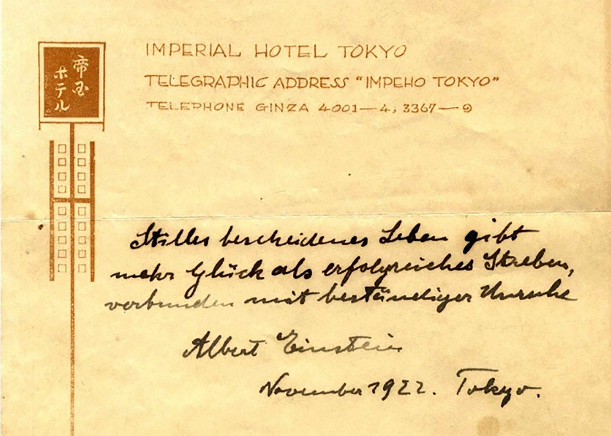 В ноябре 1922 года Эйнштейн, недавно удостоенный Нобелевской премии, приезжал в Японию с лекциями. В номере отеля «Империал» в Токио у него не нашлось мелочи «на чай» для пришедшего курьера, и Эйнштейн вместо денег дал ему две записки, уверяя, что когда-нибудь за них можно будет выручить гораздо больше обычных чаевых.