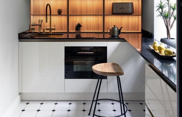 Для оформления кухонного фартука Анна выбрала оригинальный прием — она использовала выдвижные полочки из ЛДСП с подсветкой, которые скрывают газовую трубу и доступ к ней.