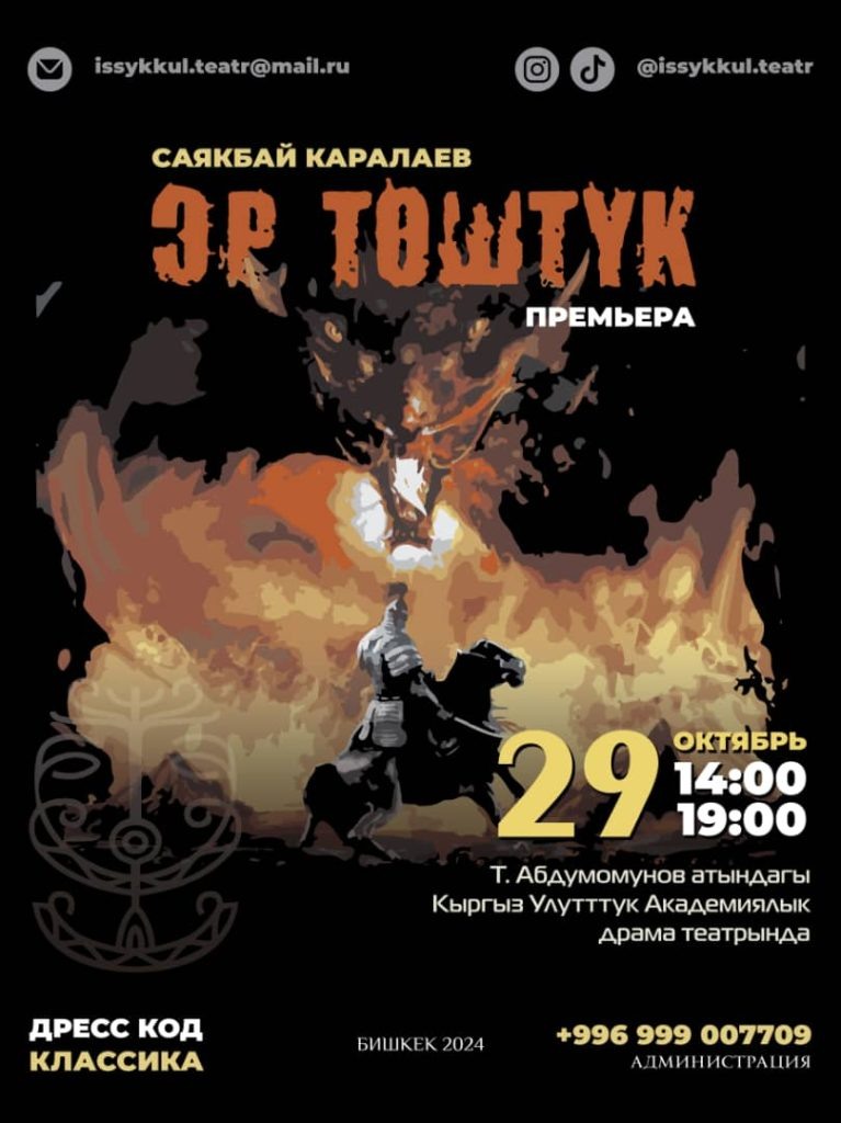🌟 29-октябрда көрүүчүлөргө Саякбай Каралаевдин уламышынын негизинде кыргыздын байыркы каада-салттары менен эпосунун атмосферасына сугарылган “Эр Төштүк” эпикалык спектакли тартууланат. Жаш чеги: 6+.