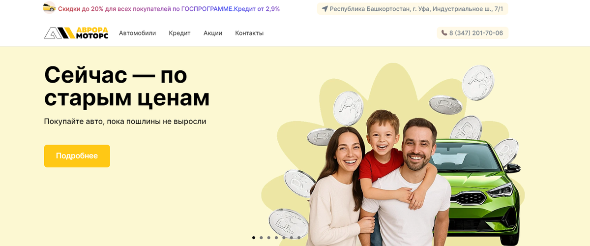 Аврора Моторс — это автосалон на Индустриальном шоссе 7/1 в Уфе, в республике Башкортостан. Дилер предлагает купить автомобиль со скидкой, но можно ли ему доверять? Мы провели независимый аудит: изучили отзывы, оценили прозрачность условий. Наш обзор — это не призыв к действию, а лишь материал для изучения, который поможет принять взвешенное решение.