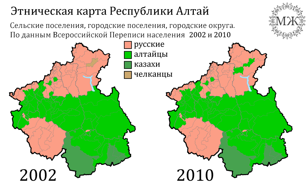 Ссылка на все ресурсы. Оригиналы изображений с полным размером и (если есть) без вотермарок доступны на Бусти за две недели до выхода новой работы. Минуло около полутора лет с выхода предыдущей части. И хоть с каждым днём фактическая актуальность сравнения переписей 15-20 летней давности с каждым годом проседает, на сегодняшний день они остаются качественным материалом, с помощью которого можно не только рассмотреть изменения в промежутке, но и выстроить примерную перспективу на дальнейший период вплоть до сегодняшнего дня. Итак, Республика Алтай. Основной этносостав, привычный для нашего понимания сегодня, возник к концу 30-ых 20-го века, когда перепись 1939 показала увеличение численности русских в два раза в сравнении с переписью 1926 года (для сравнения, алтайцы за этот же период выросли на 10% от своей предыдущей численности) и их доля составила более 70%. Шло время и доля алтайцев росла, но географически ситуация практически не менялась, рост алтайцев сосредотачивался в их зоне п
