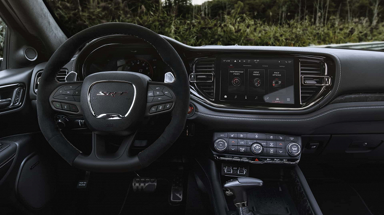 Внутри Dodge Durango SRT Hellcat Brass Monkey есть технологичная зона комфорта. Интуитивно понятная приборная панель и интерактивный дисплей, которые гарантируют, что водитель будет получать нужную информацию, не отвлекаясь от управления транспортом, так как усовершенствованная информационно - развлекательная система легко взаимодействует с любым устройством, предоставляя пользователю информацию, хорошее акустическое звучание.