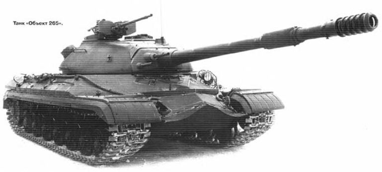 Удивительно, но об этой машине нет рассказа на страницах нашего ресурса. Вот устраняю этот пробел. Танк «Объект 265» представлял собой дальнейшее развитие танка «Объект 730». Его создание осуществлялось в период 1952-1953 годов в конструкторском бюро ЛКЗ под руководством главного конструктора Ж.Я. Котина. Основная задача разработки заключалась в том, чтобы оснастить башню танка «Объект 730» более мощным вооружением — 122-мм нарезной пушкой с высокой баллистикой, а также двумя спаренными пулемётами калибра 14,5 и 7,62 мм. Кроме этого, для борьбы с авиацией сверху на башне была смонтирована зенитная установка с 14,5-мм пулеметом KПBT. В 1954 году было создано три экспериментальных образца данной машины, которые прошли испытания на полигоне. Технические и конструкционные решения, реализованные в этом танке, позже были использованы в разработке тяжелого танка Т-10М («Объект 272»). Этот танк не стоял на вооружении и не выпускался серийно. Отличие танка «Объект 265» от танка «Объект 730» зак