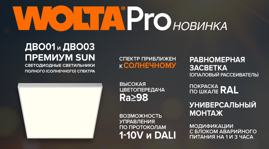 WOLTA®Pro представила новинки – универсальные светодиодные светильники ДВО01 ОФИС ПРЕМИУМ SUN и ДВО03 ЧИСТЫЙ ОФИС ПРЕМИУМ SUN. SUN – это светильники со спектром излучения максимально приближенным к естественному солнечному свету. Индекс цветопередачи Ra≥98. Панели могут использоваться для освещения общественных, офисно-административных, учебных, торговых и медицинских помещений. ДВО03 ЧИСТЫЙ ОФИС ПРЕМИУМ SUN отличается опаловым рассеивателем, что гарантирует равномерную засветку. Модельный ряд представлен мощностями 36 Вт и 54 Вт. Вы можете выбрать модели ДВО01 ОФИС ПРЕМИУМ SUN мощностью 18 Вт, 36 Вт и 54 Вт, а также варианты цветовой температуры (3000К, 4000К, 5000К и 6500К). Панели могут устанавливаться в потолки типа Армстронг, а также накладным, так и подвесным способом. Освещение от WOLTA®Pro отличается качеством и высокими светотехническими характеристиками. При желании заказчика корпус панелей может быть покрашен по палитре RAL.