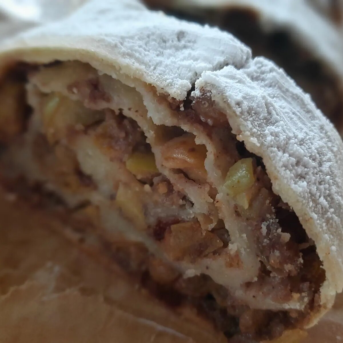 Готовый штрудель посыпаем сахарной пудрой.