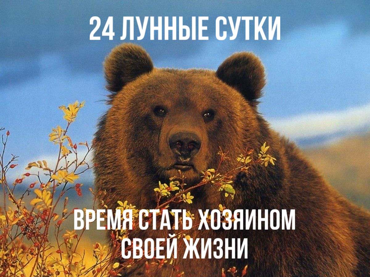 На 24-м дне лунного цикла нашим наставником становится Медведь. В метафорическом сравнении человека с Медведем на фоне лунных дней, мы можем найти аналогию не в поведении хищника, а в возрастных этапах. Медведи в природе живут от 50 лет, но обычно не доживают до такого возраста, проживая от 18 до 30 лет. В человеческой жизни четвертая фаза Луны символизирует зрелый возраст. В этот период преобладают не агрессивные, а мирные энергии. В такой момент мы можем испытывать упадок работоспособности, чувствовать пассивность и усталость. Медведь считается владельцем леса или тайги, где он обитает. Каждый из нас является хозяином своей жизни и территории, на которой проживает. В этом контексте не имеет значения, какая именно территория наша, и какие у нас статусы или должности. Медведь символизирует мощь и честность, качества, которые кроются в каждом человеке и позволяют ему стать владельцем собственной судьбы. В то время как животное движется по пути инстинктов, человек способен к