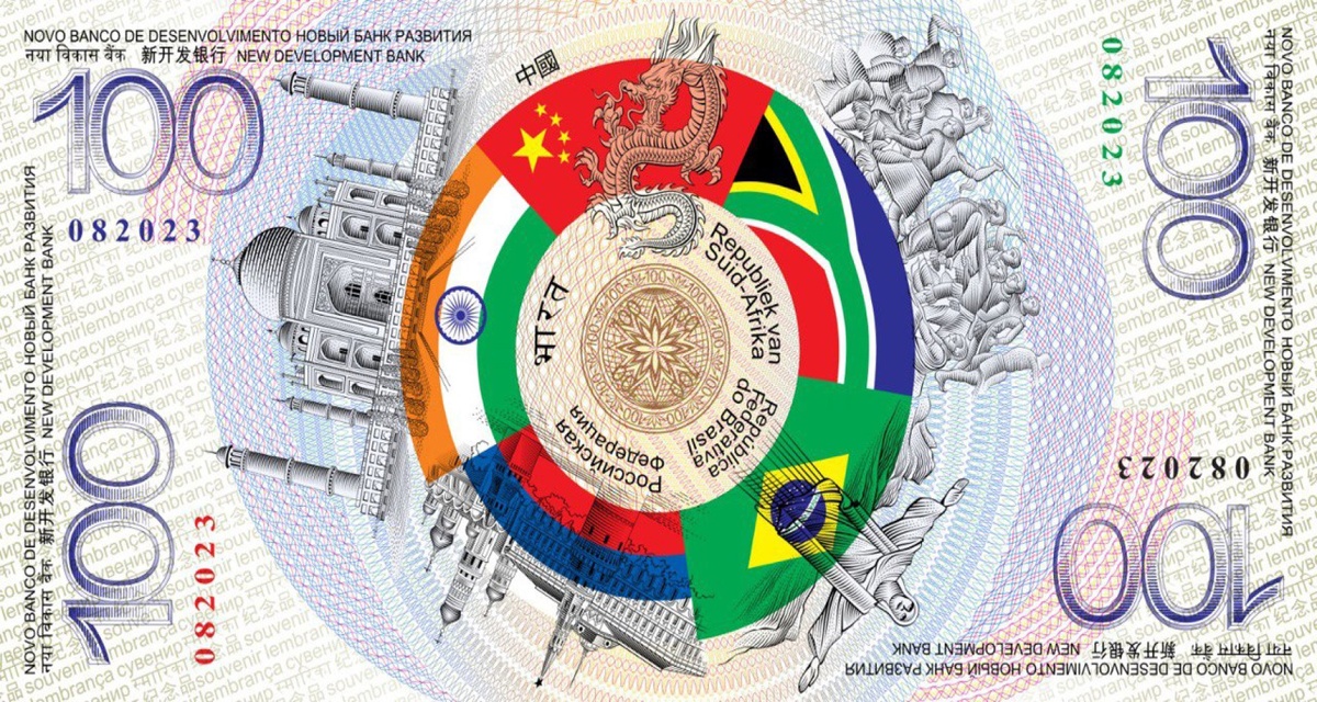 На лицевой стороне банкноты изображены государственные флаги и наиболее узнаваемые символы Бразилии, России, Индии, Китая и Южной Африки. На обороте указаны флаги и названия других стран, которые подали заявки на вступление в БРИКС. Владелец типографии Евгений Федоров рассказал, что расположение флагов по кругу на лицевой стороне банкноты символизирует идею равенства стран — участниц БРИКС. Впервые в истории на купюре применена четверная нумерация — номинал банкноты указан в каждом углу таким образом, чтобы при ее повороте вокруг своей оси наверху оказывались флаги разных государств, а «100» читалось горизонтально.