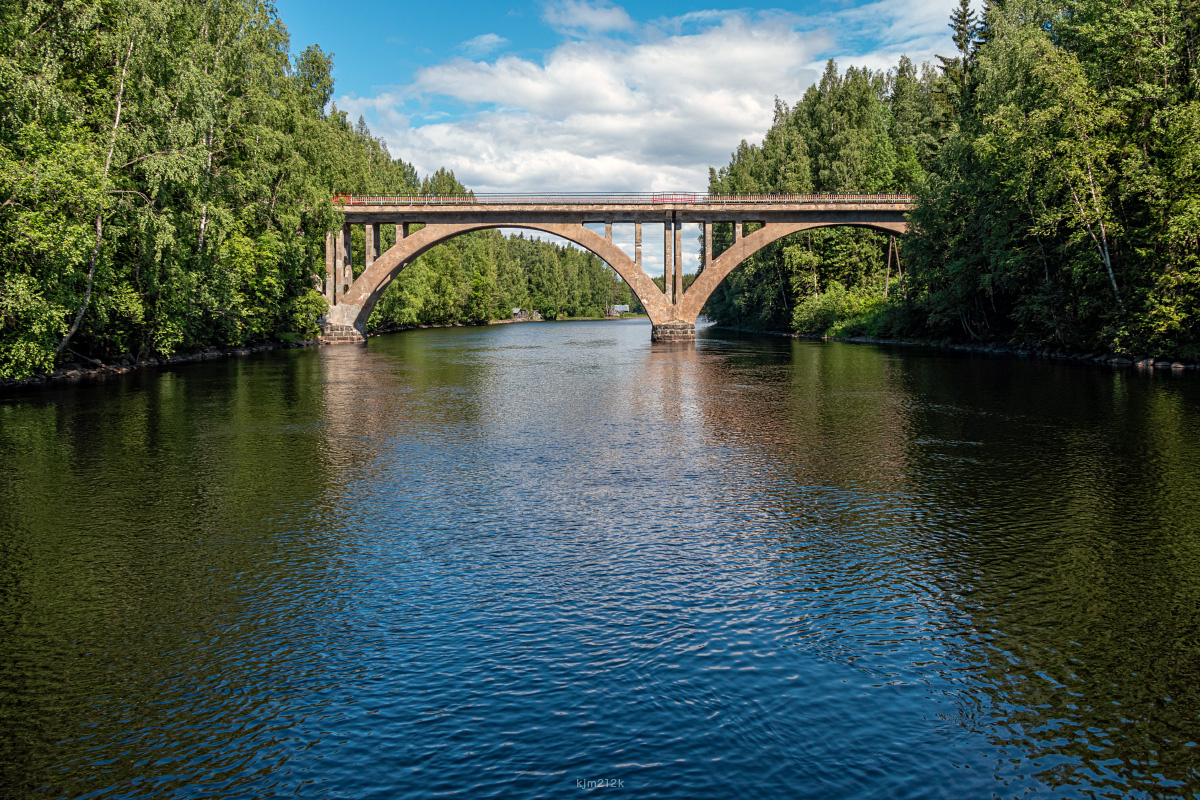 23 июня. В заключительный день, перед тем как отправиться в долгую дорогу домой, заехали к финскому арочному мосту через реку Янисйоки, построенному в 1919 году. Мост по-прежнему используется по назначению, по нему ходят поезда. Чуть ниже моста река перегорожена плотиной, с которой открывается отличный вид на сам мост. Плотина интересная: основа железобетонная, а течение перекрыто рядом деревянных брусьев, которые под напором воды ходят ходуном и стучат. Историческая справка из интернетов: