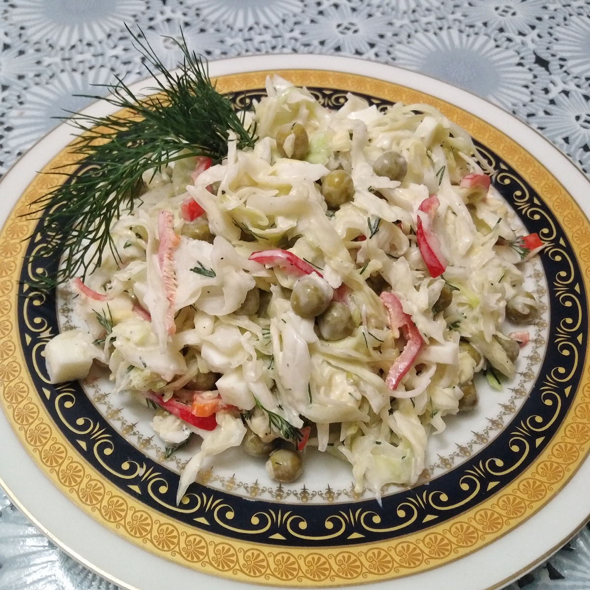 Этот салат пополнил мою коллекцию любимых салатов. Он прост в приготовлении и состоит из простых продуктов, которые можно найти в любом магазине. Ингредиенты : Сладкий перец мою, удаляю сердцевину, а мякоть режу тонкими полосками. Капусту шинкую мелко, после чего вылаживаю в глубокую миску и мну с солью. Яйца варю вкрутую и измельчаю. В миску с капустой добавляю зелёный горошек, мелко нарезанные варёные яйца, рубленую зелень укропа, сладкий перец, майонез и перец молотый. Все перемешать и можно подавать. Приятного аппетита!