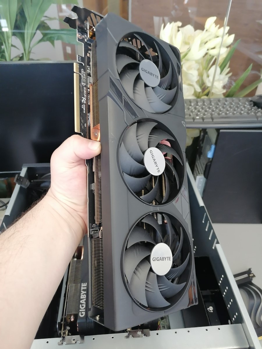 - Боремся с неудачным расположением кабелей питания видеокарт. Для этого карты меняем на GIGABYTE GeForce RTX 4090 WINDFORCE V2 24G. Карта от GIGABYTE дороже, но имеет ряд преимуществ, одно из которых может быть критически важным. А именно — расположение разъёма питания. Он расположен таким образом, что кабель питания располагается параллельно видеокарте, а не поперёк, как у Palit. Это позволяет использовать более узкие корпуса компьютеров.