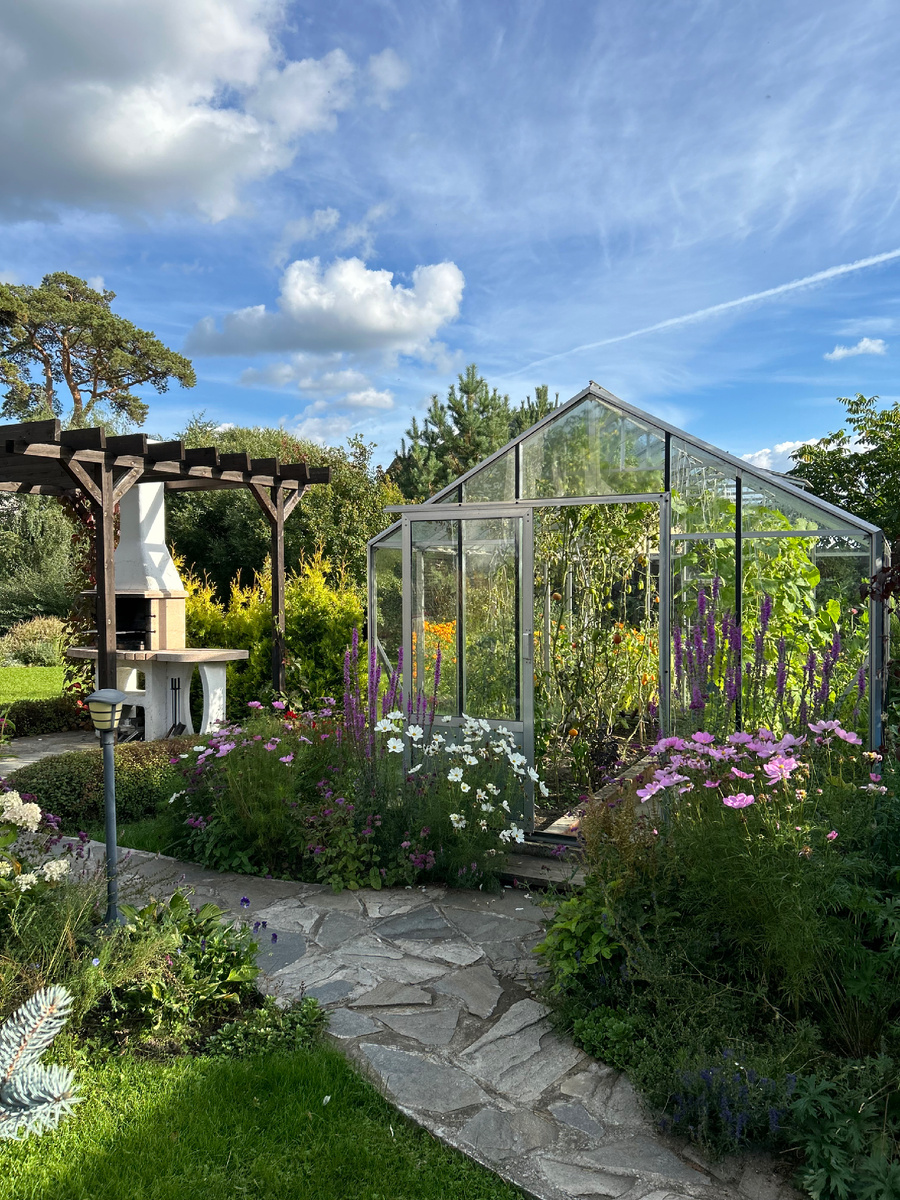 Давно собиралась написать что-нибудь про свою теплицу, и вопросы были, и в целом тема нужная и интересная. Я уже привыкла, что наша теплица из стекла и алюминия нравится читателям, её внешний вид, практичность, то, как она вписана в сад... И вдруг прочитала комментарий с совсем другим настроем. Здравствуйте. Я создаю своими силами уже второй сад, навыки дизайна приобретаю собственным опытом, методом проб и ошибок. Растения в большинстве своём выращиваю из черенков, семян. Если приобретаю, то так же по минимальной цене в момент распродаж. Я не архитектор и не ландшафтный дизайнер, но вот вашу теплицу смогла бы завуалировать. Уж слишком она зияет и портит вид сада, это моё мнение. Только не думайте, что я расстроилась. Во-первых, мы все разные, и то, что кажется красиво и целесообразно мне, может не нравится другому. Это совершенно нормально. Во-вторых, я понимаю, что хотел сказать читатель. Возможно, в идеальном саду, который создан для прогулок и созерцания, нет места утилитарной ко