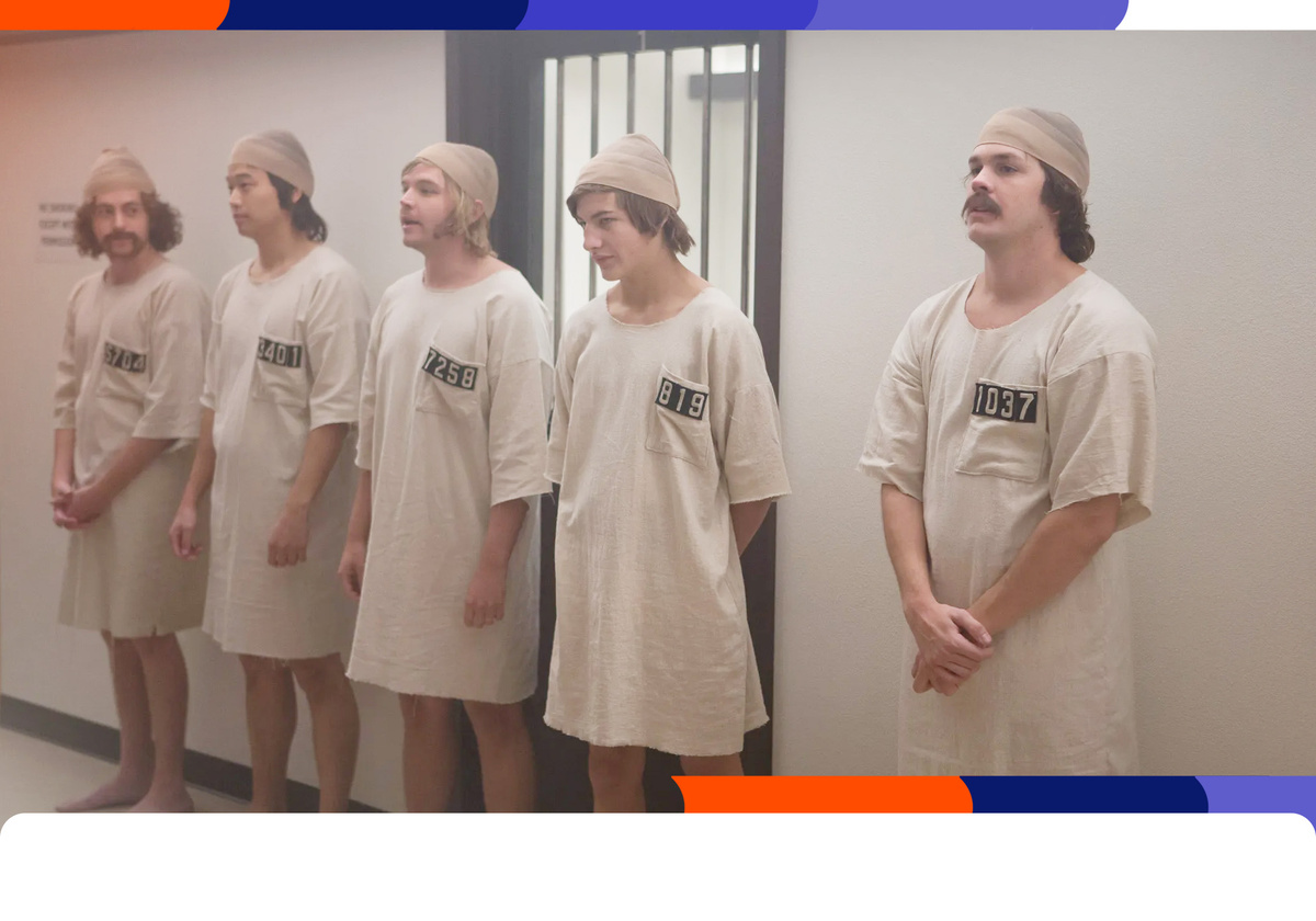 Студентов рандомно поделили на две группы. Одних одели в тюремные робы и поместили в импровизированные камеры. Вторых обязали в составе трёх человек по очереди выходить на восьмичасовую смену и играть роль надзирателей. На инструктаже Зимбардо запретил им причинять физический вред арестантам, однако во всём остальном психолог развязал им руки. Вседозволенностью тюремщики начали пользоваться с первых часов эксперимента. Они всячески унижали заключённых, заставляя их отпрашиваться в уборную и обращаться друг к другу только по номерам. Ночью надзиратели подняли заключённых в 2:30 громкими свистками и приказали им отжиматься.