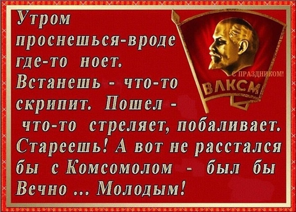 Эх, девочки-мальчики, ну и денек сегодня! День рождения Комсомола! Целых 105 лет исполнилось! Сначала не хотела его даже упоминать, но чем ближе праздник, тем больше желания все-таки вспомнить былые времена, отдав должное организации, которая была в нашей жизни. Лично для меня это хорошая возможность вспомнить молодость, что я очень люблю делать. Наше поколение выросло на идеалах коммунизма, с детства из нас делали настоящих коммунистов. Сначала воспитывали октябрят, затем мы жили по пионерским законам. Будь готов! Всегда готов!. И я уже не знаю, это было хорошо или плохо. Это было, это наша жизнь. Тогда я была счастлива, сейчас смеюсь. Кстати, приняли меня в комсомол, когда мне еще 14 не было. На майские праздники приняли самых лучших учеников из нашего класса. А я была отличницей и старостой класса. Ну кого, как не меня? Поначалу я гордилась, но потом до меня дошло, что это ужасная фикция и сплошное притворство! Это было время юношеского максимализма, я не терпела обмана, поэтому нач