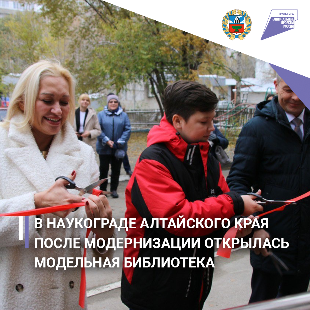 В наукограде Алтайского края после капитальной модернизации торжественно открылась модельная библиотека №7 по адресу ул. Декабристов, 25. Это стало возможным благодаря национальному проекту «Культура», и библиотека стала седьмым подобным учреждением в регионе. На модернизацию пространства было выделено около 15 млн рублей. Из них 7 млн были направлены на покупку мебели и современного оборудования в рамках нацпроекта, остальные средства город вложил в ремонт помещений по разработанному дизайн-проекту, при поддержке региона. Заместитель министра культуры Алтайского края Алексей Бочаров на открытии отметил: «Библиотека – это место, где дети получают знания, поэтому таким культурным объектам нужно уделять особое внимание». После обновления библиотека изменилась до неузнаваемости. Проведены работы по замене систем отопления, канализации, водо- и электроснабжения, выполнена внутренняя отделка и ремонт входной группы, что делает учреждение доступным для людей с ограниченными возможностями. Пр