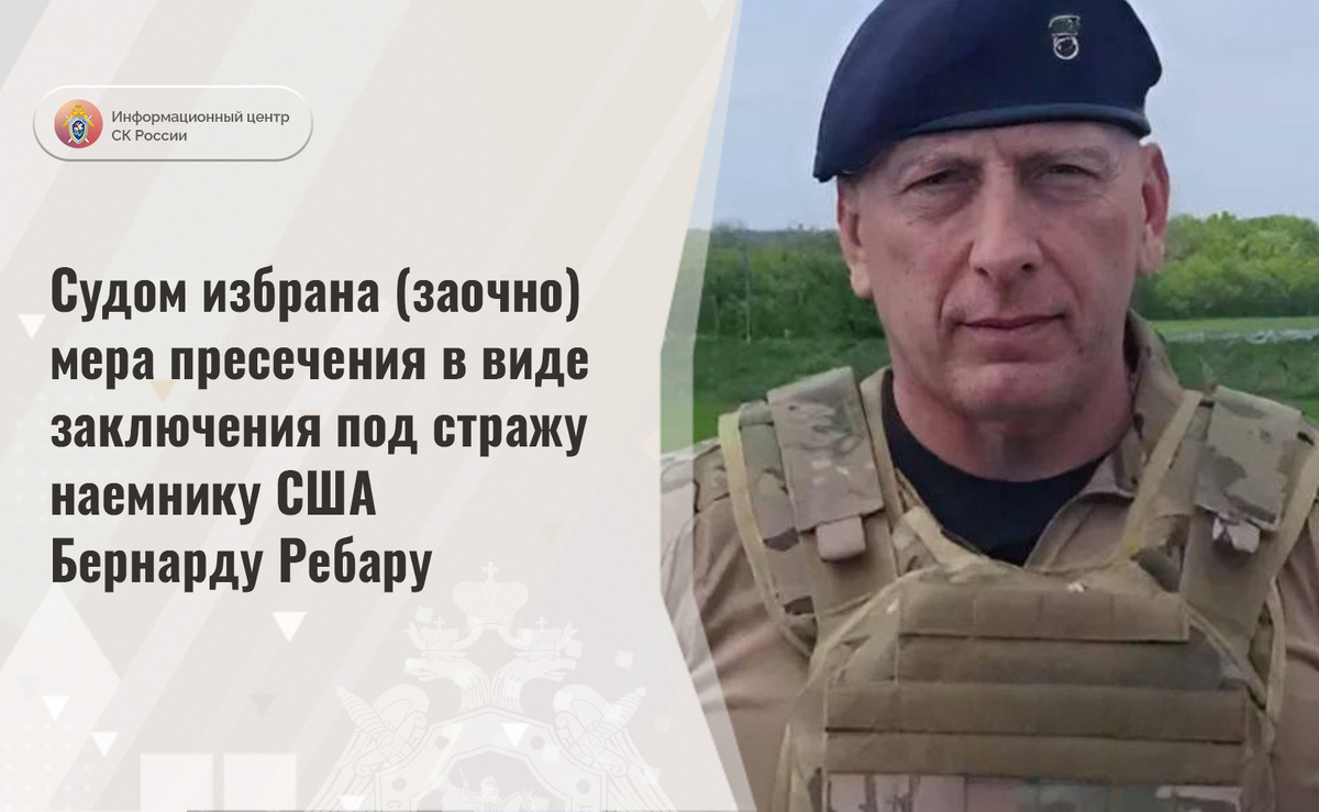 По ходатайству следователя Главного военного следственного управления Следственного комитета Российской Федерации суд избрал (заочно) наемнику США Бернарду Ребару меру пресечения в виде заключения под стражу.