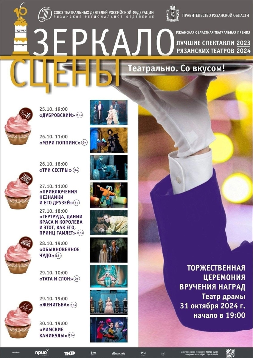 На фестиваль «Зеркало сцены» каждый театр в Рязани представляет два спектакля. Афиша этого года включает в себя девять представлений. Фестиваль начнется 25 октября со спектакля «Дубровский» (12+) в Рязанском музыкальном театре.