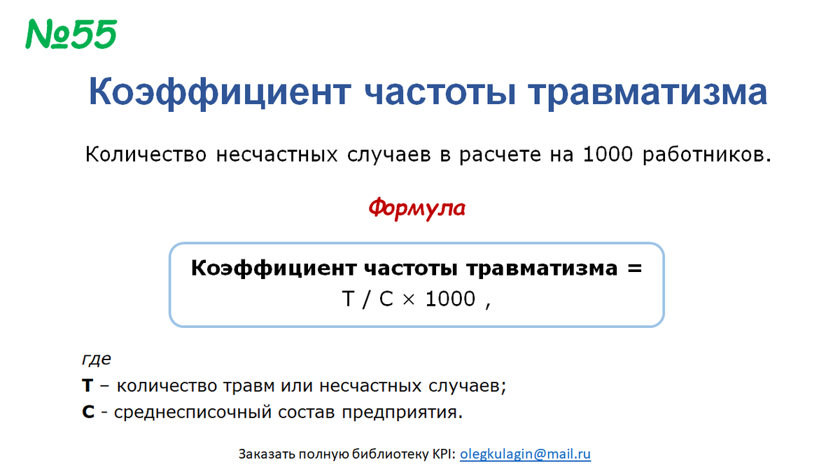 Друзья! Сегодня пятница и новый показатель в вашу коллекцию ключевых показателей бизнеса! Коэффициент частоты травматизма показывает количество травм или несчастных случаев на одного работника в пересчете на 1000 человек. Желаю вам здоровья! ТОП-100 ключевых показателей бизнеса Полная библиотека KPI Программно-методический комплекс KPI-Excel