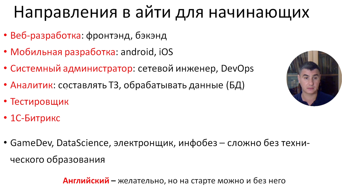 Сегодня всё больше людей задумываются о смене профессии и переходе в IT, привлекаемые высокими зарплатами, возможностью удалённой работы и перспективами карьерного роста. Однако, стоит понимать, что IT — это многогранная сфера, и программирование, хоть и одно из ключевых направлений, но подходит далеко не всем. В видео я рассказываю о том, как не-айтишнику можно стать айтишником, какие направления можно выбрать и с чего начать свой путь в IT. Надеюсь видео будет полезно тем, кто задумывается о смене профессии и хочет попробовать себя в it сфере! Сегодня всё больше людей задумываются о смене профессии и переходе в IT, привлекаемые высокими зарплатами, возможностью удалённой работы и перспективами карьерного роста. Однако, стоит понимать, что IT — это многогранная сфера, и программирование, хоть и одно из ключевых направлений, но подходит далеко не всем. В видео я рассказываю о том, как не-айтишнику можно стать айтишником, какие направления можно выбрать и с чего начать свой путь в IT. Н