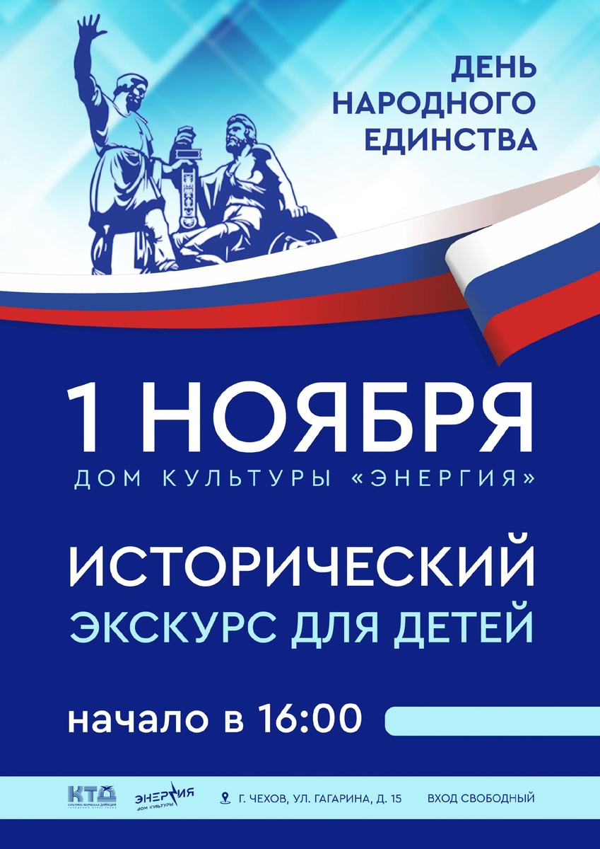 💥 Исторический экскурс для детей ко Дню народного единства 4 ноября вся наша страна отмечает праздник День народного единства! Это дата исторической мудрости российского народа, символ независимости, государственности и жизнестойкости России. Мы по праву гордимся нашей страной, ее успехами и достижениями, верим в ее будущее. Всех нас объединяет чувство гордости за нашу Родину, за ее славную историю. И в этот праздник с особенной силой ощущаем, что мы – единый и могучий русский народ, и у нас одно Отечество – Россия. Приглашаем всех ребят 1 ноября на нашу познавательную программу. Вы узнаете много нового и интересного. 📶 Категория: Прочие 🚫 Возраст: 0+ 📆 01.11.2024 🕕 16:00 🏢 ДК «Энергия» 📍 г.о. Чехов, ул. Гагарина, д.15 🪙 Стоимость билетов - Бесплатно❗️
