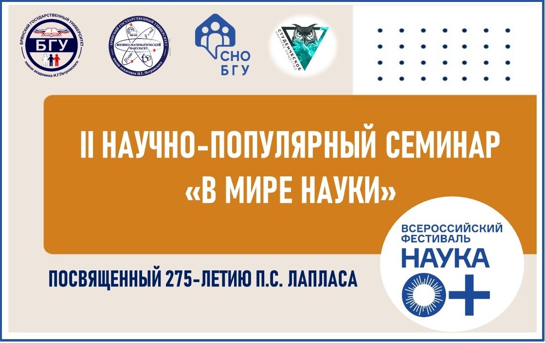 24 октября в рамках мероприятий Всероссийского фестиваля «Наука 0+» на площадке физико-математического факультета состоялось очередное расширенное заседание ежегодного научно-популярного семинара «В мире науки», посвященного 275-летию со дня рождения великого французского математика, механика, физика, астронома, одного из создателей теории вероятностей Пьера Симона Лапласа. Организатором мероприятия выступила кафедра математического анализа, алгебры и геометрии. В работе семинара приняли участие преподаватели, аспиранты, студенты физико-математического факультета, а также учащиеся 9-11 классов школ г. Брянска и их наставники – учитель математики МБОУ СОШ №45 г. Брянска М.В. Савина, учитель математики и информатики МБОУ СОШ №72 г. Брянска Е.В. Костыря и учитель математики МБОУ «Синезерская СОШ» А.А. Журавкова. С приветственным словом к участникам семинара обратился декан факультета, кандидат педагогических наук, доцент А.В. Савин, который отметил огромный роль Всероссийского фестиваля в